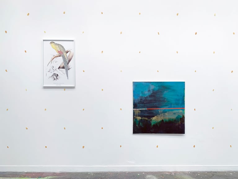 De gauche à droite : Dylan Caruso, Porn flakes, 2023 | Raphaëlle Peria, Ornithologie disparue, 2022 | Stéphani Hab, BA:AB AI.B, 2020