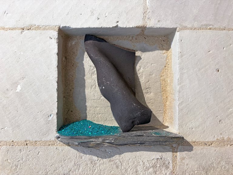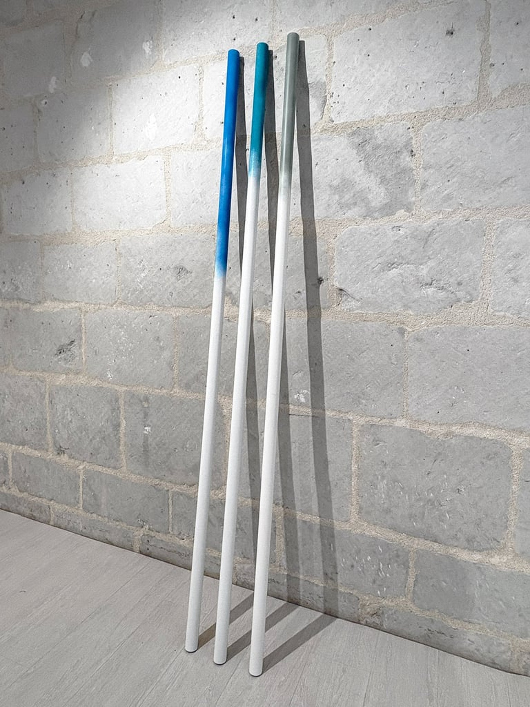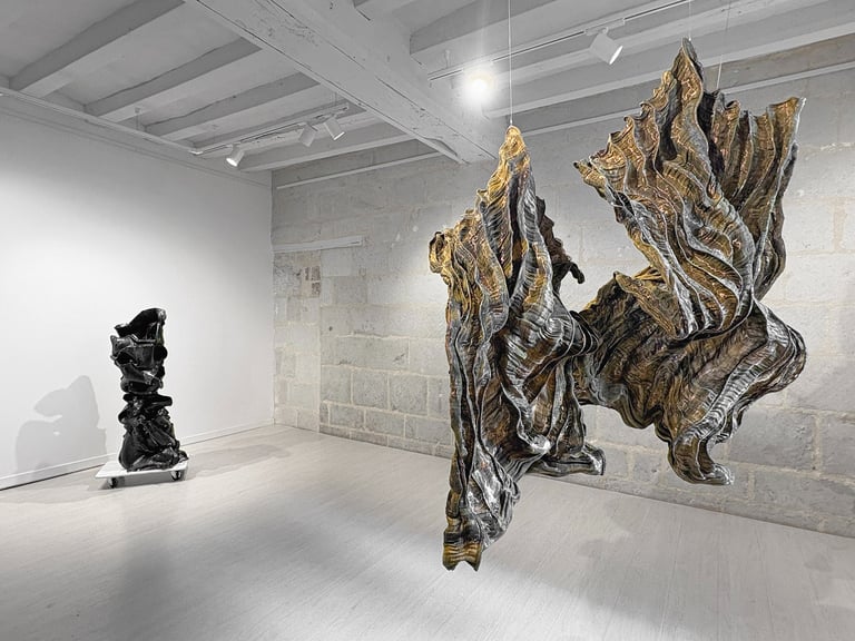 De gauche à droite : Nelson Aires, Sanguis - Accrochage #2, 2016-2025 | Sarah Krespin, Vague (bleu), 2025