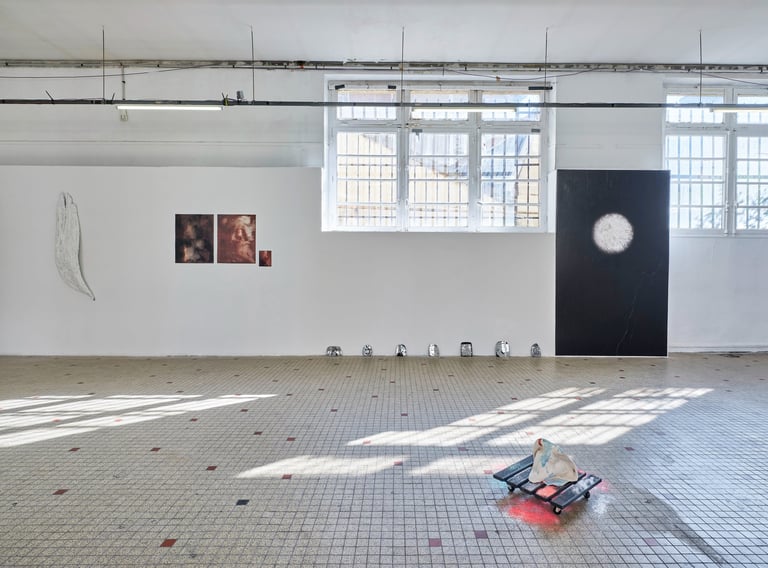 De gauche à droite : Géraldine Guilbaud, Aile blanche, 2024 | Nelson Aires, Sang d’encre - Accrochage #2, 2023-2026 | Claire Poisson, Rétroviseurs, 2026 | Hélène Néraud, La série des Demoiselles, 2026 | Dylan Caruso, Over the Moon #5, 2015