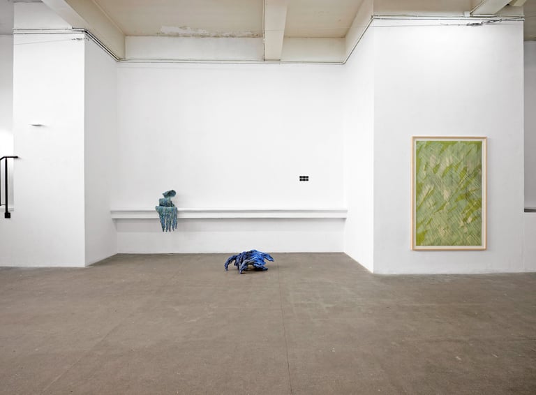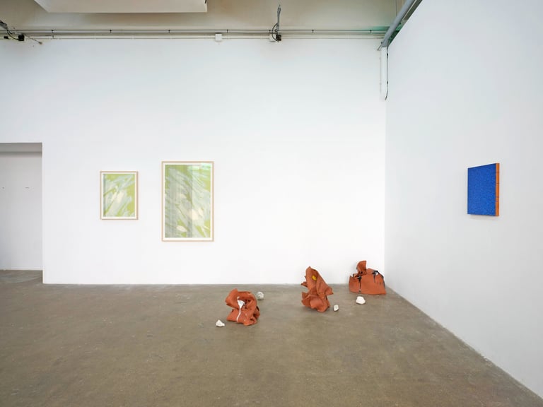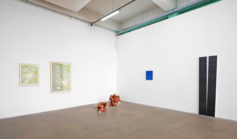 De gauche à droite : Dylan Caruso, Tourillons, 2025 | Géraldine Guilbaud, Sans titre XXI, 2024 | Géraldine Guilbaud, Cornwall, 2023 | Nelson Aires, Bloodstone (série 2), 2019