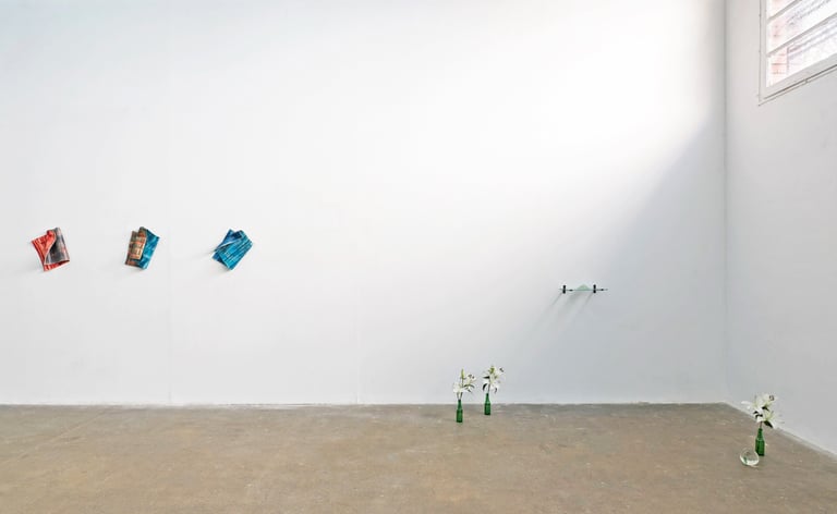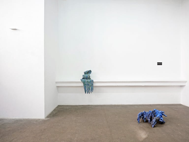 De gauche à droite : Dylan Caruso, Tourillons, 2025 | Nicolas Muller, Sans titre, 2025 | Nicolas Muller, Sans titre, 2025 | Hélène Néraud, Incredible India -States remix-, 2016-2026 | Cyrielle Gulacsy, CS029, 2024 | Mathieu Bonardet, Disjonction I, 2019