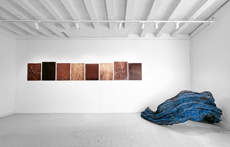 De gauche à droite : Nelson Aires, Sanguis - Accrochage #2, 2016-2025 | Sarah Krespin, Vague (bleu), 2025