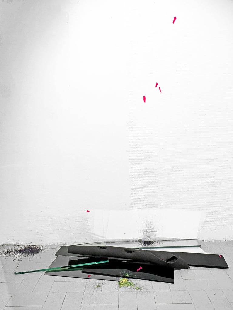De gauche à droite : Hélène Néraud, Look at yourself (bright bright bright!), 2025 | Samuel Aligand, Jonction, 2025 | Samuel Aligand, Récif (vert), 2023
